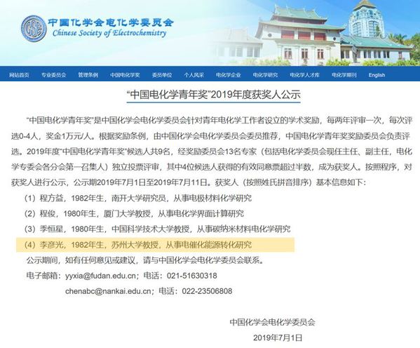 “中国电化学青年奖”是中国化学会电化学委员会针对青年电化学工作者设立的最高学术奖励,每2年评选一次,每次评选0-4人,授予在电化学科学与技术研究中取得突出成绩、具有很大发展潜力的、40周岁以下的我国优秀青年电化学工作者。2019年度“中国电化学青年奖”最终有4位候选人获奖,我院李彦光教授以在电催化能源转化研究方面的突出工作获此殊荣。