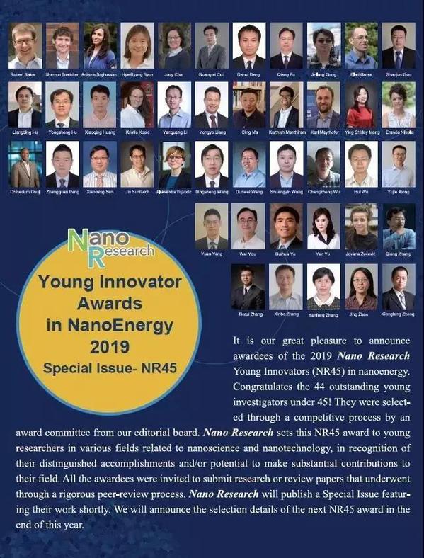 纳米研究青年创新奖(Nano Research Young Innovator Awards)是Nano Research编委会于2018年首次设立的国际性的纳米研究青年创新奖,旨在表彰对纳米科学技术相关领域做出突出贡献的青年科研人员。此奖项每年评选一次,由Nano Research杂志编委组成的评奖委员会,在全球范围内通过遴选流程确定最终人选。今年的奖项评比仅在纳米能源科技领域开展,全球共44位年龄不超过45周岁的青年学者入选。Nano Research将出版专刊展示本次所有获奖者的工作成就。