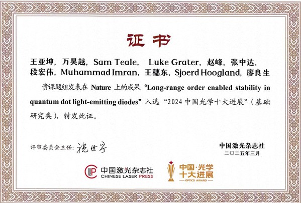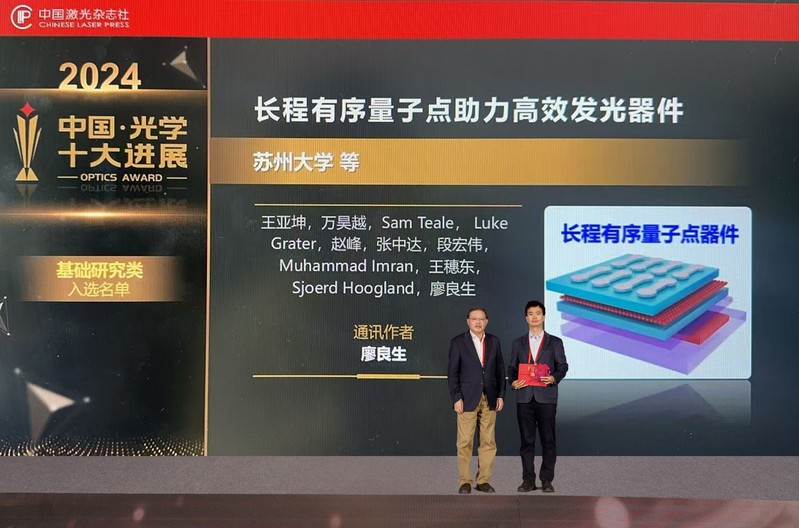 近日,中国激光杂志社正式发布2024中国光学十大进展。经过评审委员会多轮遴选,苏州大学功能纳米与软物质研究院(FUNSOM)廖良生教授、王亚坤副教授及其团队的研究成果《长程有序量子点助力高效发光器件》成功入选2024中国光学十大进展(基础研究类)。在此谨向廖良生教授、王亚坤副教授及其团队表示热烈祝贺!