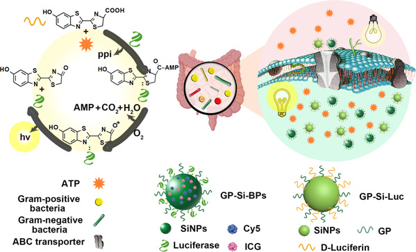 近年来,光学成像技术的应用使得在分子水平上提供定位、定性和定量的细菌信息成为可能。其中,荧光成像作为应用最广泛的光学成像方法,需要实时的光激发,但可能会受到生物组织的背景自身荧光干扰,导致信噪比相对较差。相比之下,由于无需外部光照射,生物发光成像(bioluminescence imaging, BLI)具有更低的背景、更高的灵敏度等优点。目前,用于细菌检测的生物发光成像系统基本可以分为两类:1)内源性BLI系统,涉及细菌基因工程表达荧光素酶;2)外源性BLI系统,在细菌裂解产生的ATP存在下,外源性荧光素酶催化外源性荧光素或笼状荧光素底物氧化产生自发光。尽管生物发光成像(BLI)取得了很大的进步,但它在细菌成像方面仍存在固有不足,主要表现在两方面,一是内源性BLI系统需要对细菌进行基因改造;二是外源性BLI系统需要破坏细菌细胞以消耗细胞内ATP,因此无法对活细菌进行成像。