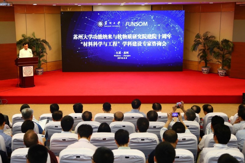 江涌书记在致辞中对与会的嘉宾表示热烈欢迎,向一直以来关心和支持我校发展的专家、领导表示衷心感谢。他说,2008年我校以李述汤院士的引进为契机组建了功能纳米与软物质研究院,翻开了材料科学、化学、物理学、电子学、生物学、医学等学科建设及其交叉领域学科建设发展的新篇章。十年来,在李述汤院士的带领下,研究院依托学校综合性大学的平台优势,深耕区域沃土,不断改革创新,在人才培养、师资建设、科学研究、学科建设,协同创新、国际交流合作等方面取得了令人振奋的成绩。他强调,建院十周年,既是一个重要的里程碑,也是一个崭新的起点。希望大家戒骄戒躁,深入学习贯彻习近平总书记在北京大学师生座谈会和两院院士大会上的重要讲话精神,坚持创新驱动发展,瞄准国家战略需求和国际学术前沿,汇聚高水平人才队伍,加强学科之间协同创新,大力培养工程实践能力强、创新能力强、具备国际竞争力的高素质复合型“新工科”人才,要争取在不久以后的将来产出一批示范性、引领性、标志性、重大开创性成果,为苏大建设国内一流、国际知名高水平研究型大学,为我们江苏和苏州实现高质量发展走在前列贡献一份力量。江涌书记表示,借此机会希望各位专家畅所欲言,多为苏州大学发展、研究院建设和“材料科学与工程”学科建设出谋划策。