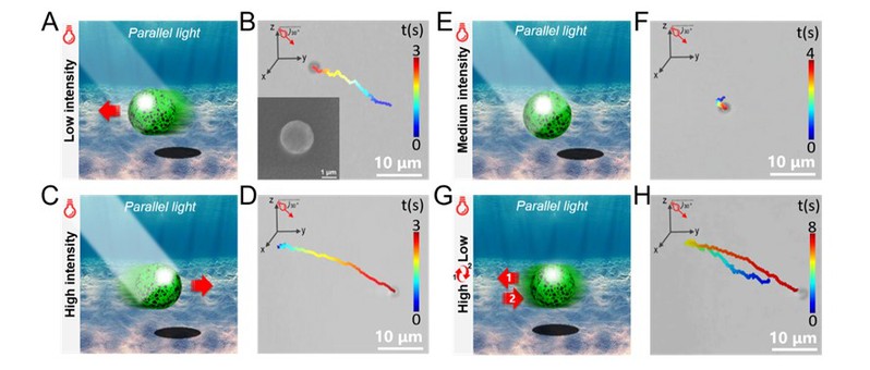 自然界中的微生物(比如绿藻)具有“双向”光趋向性的特点。其既可以向弱光的方向游动,以便通过光合作用获取更多的能量,也可以远离强光,从而避免受到伤害或逃离捕食者的攻击。受到绿藻的启发,人们一直致力于发展能够感知光强,并且能够依赖光强的变化而自主运动的游动微纳米机器人。然而,这要求游动微纳米机器人的各个组成部分都对光具有自感知,自适应的能力,因此极难实现。