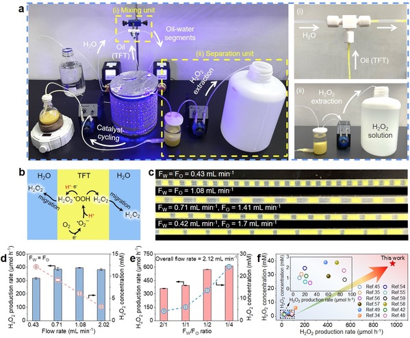 针对上述问题,苏州大学功能纳米与软物质研究院(FUNSOM)李彦光教授、黄伟副教授合作设计了一种新型双相流动光催化反应体系,实现了不间断H2O2光合成、自动产物提取和催化剂循环使用。为满足该反应体系的要求,团队首先设计合成了一种全氟烷基功能化的共价有机框架(PF-BTTA-COF)光催化剂,其具备优异的超疏水性质、较高的光催化产H2O2活性及稳定性。在此基础上,将含有上述光催化剂的油相与水分别泵入到微管反应器中,形成连续交替的油-水两相微区。在光照下,油相中生产的H2O2通过界面自发向水相迁移并富集,随后在收集器中实现H2O2水溶液和油相分散液的相分离,从而实现产物的即时提取和催化剂的循环利用。通过优化反应参数,H2O2的产率最高可达968 μmol h−1,比传统体系高出1~2个数量级;同时,所获取的H2O2浓度在2.2~38.1 mM范围内可调。在连续100 h的测试中,该反应系统展现出良好的稳定性,最终获得了6升浓度为5.7 mM的H2O2溶液,可满足杀菌和废水处理的浓度要求。另外,技术经济分析表明,该反应体系在实际大规模H2O2光合成中具备显著的经济效益。本研究为H2O2的连续光合成及现场制备提供了一种经济可行的绿色、高效替代方案。相关成果在期刊Nature Communications上发表(Nat. Commun. 2024, 15, 8023)。