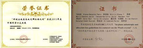 2015年“中国科学十大进展”与2018年“中国光学十大进展”荣誉证书
