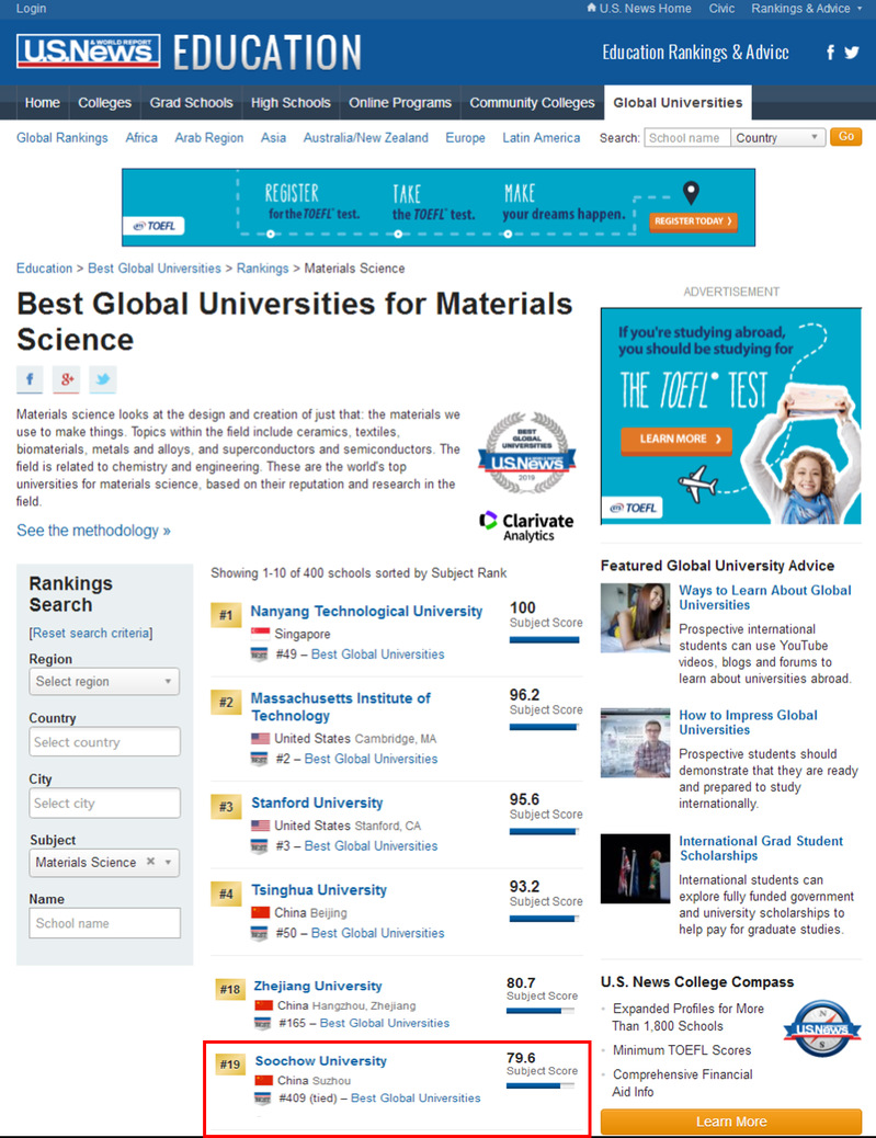 近日,U. S. News世界大学排名发布,在“材料科学”学科排名中,苏州大学名列世界第19位,在中国高校中排名第7位,国内高校排名前六位的依次是:清华大学、复旦大学、北京大学、上海交通大学、中国科学技术大学和浙江大学。