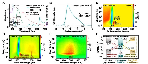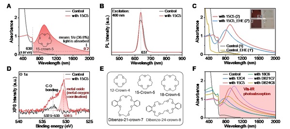 近日,苏州大学功能纳米与软物质研究院孙宝全教授团队,联合北京大学赵清教授和电子科技大学赵怡程教授等团队提出了一种创新的“超分子诱导”策略。该策略在金属卤化物半导体中引入超分子冠醚,成功将材料的光吸收范围显著拓展至可见至红外光(2000 nm),同时保持了高吸光度。同时,对于多种不同分子结构的超分子冠醚,以及不同相结构的金属卤化物半导体(如β-黑相和δ-黄相),均能实现可见至红外光吸收的拓展,表现出良好的普适性。超分子冠醚通过与金属卤化物半导体之间的超分子主客体相互作用,不仅调制了晶格结构,还诱导形成了一种全新的物质晶体相——超分子杂化晶体。原金属卤化物半导体晶体与超分子杂化晶体共同构出具有双相结构的“自组织图灵结构的金属卤化物半导体”薄膜。通过光电子能谱和超快飞秒瞬态吸收光谱等表征技术,研究揭示了显著的可见至红外光吸收拓展背后的物理学新机制:在图灵结构金属卤化物半导体的杂化物质系统内(即金属卤化物半导体晶体与超分子杂化晶体之间),存在相间电子跃迁现象。最后,该材料制备的可见至近红外光电探测器的性能表现,进一步验证并展现了其光吸收拓展在实际光电应用中的巨大潜力。