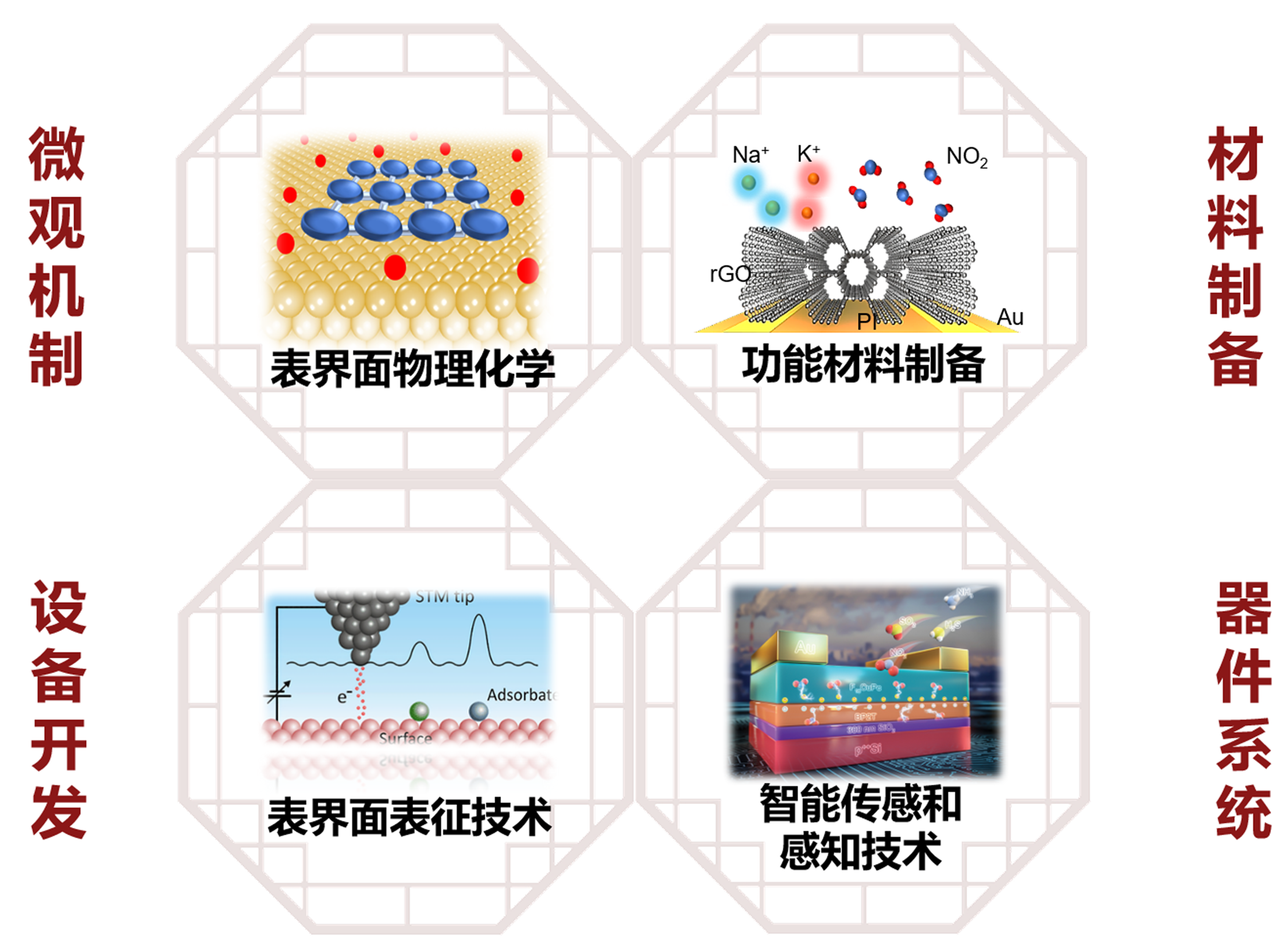 以表界面物理化学为核心,围绕表界面分子科学/表界面智能材料两个方向开展工作。其中表界面分子科学方向主要运用原子力显微镜(AFM)和扫描隧道显微镜(STM)开展表界面物理化学的研究。期望从原子、分子分辨的水平上对功能材料在模型化表界面的组装、结构、性质及在位反应过程做出系统性研究,探索新型碳基功能材料的应用基础。表界面智能材料方向主要聚焦于结构化功能材料表界面、响应性表界面和智能感知器件/系统等研究领域,其研究目标在于发展新型智能材料的精准制备和性质调控方法,并以此基础开展多功能感知和智能传感系统研究。