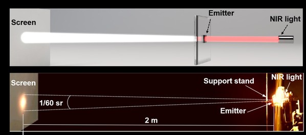 利用近场限域效应实现无需光学元件,仅依赖材料自身性质的远场定向白光发射: