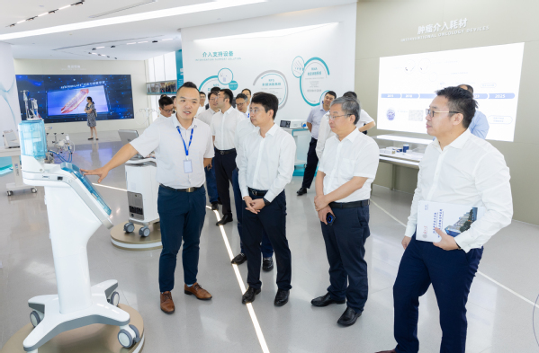 最后,张桥校长一行还参观了恒瑞医疗展厅,苏州研发中心负责人徐孙希为各位领导介绍了恒瑞医疗重症治疗、给药支持等医疗器械和药械组合产品,并展示了恒瑞医疗自主研发生产的、国内目前唯一一款整台套、全系列国产化的ECMO系统。