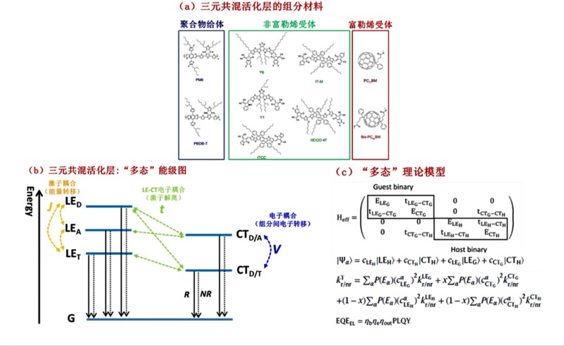 相比于其他太阳能电池,有机太阳能电池(OSC)因其具有柔性、半透明等独特优势而受到广泛关注。目前,在单结有机太阳能电池中,活性层由三个组分材料混合而成的三元有机太阳能电池(TOSCs)表现出最高的光电转换效率,其认证效率超过19%。但是,TOSC的效率仍然远低于钙钛矿太阳能电池(认证效率超过26%)。造成TOSC光电转换效率低的主要原因是它的开路电压比钙钛矿太阳能电池低很多,这是因为电荷在非辐射复合的过程中产生了电压损失。因为TOSC活性层形貌复杂、电荷产生与复合机理不明,所以TOSC非辐射电压损耗的微观机理尚不清楚,这限制了三元共混活性层的合理设计与TOSC效率的进一步改善。