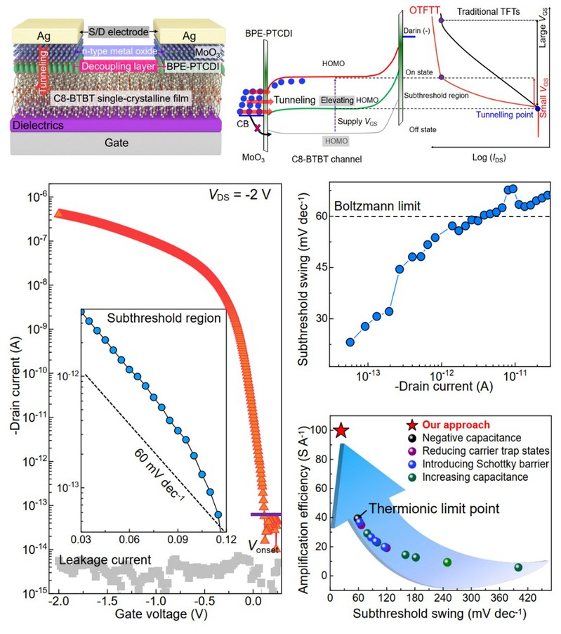 柔性电子作为一项颠覆性科学技术,正在重塑电子设备的形态与功能,是引领后摩尔时代信息技术变革性发展的重要方向。有机薄膜晶体管凭借其本征柔韧性、生物相容性、功能可调以及可大面积高效加工等优势,是柔性显示、脑机接口、可穿戴健康监测、智能传感、柔性芯片等未来万亿级产业的核心元器件。随着集成系统中晶体管密度的增加,功耗逐渐成为一个不可忽视的问题,要满足柔性电子应用需求,有机薄膜晶体管不仅需要具备足够高的电学性能,还须能在足够低的工作电压下运行。然而,如何在低电压下维持有机薄膜晶体管的高电学性能,一直是该领域的核心难题。这一难题主要归因于传统有机薄膜晶体管的亚阈值摆幅(SS)受制于玻尔兹曼热电子发射理论的限制,导致其在室温条件下的SS无法低于60 mV dec-1。