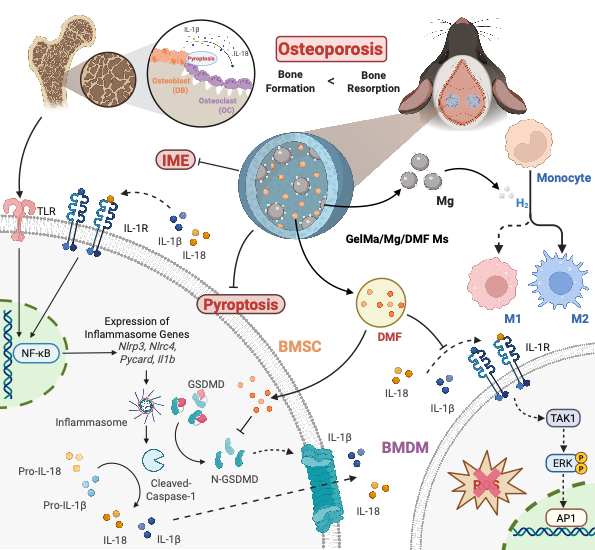 近期,我院程亮教授团队与苏州大学附属第一医院杨惠林教授、邹俊教授团队合作,开发了一种镁-明胶复合微球支架(GelMa/Mg/DMF MS),该支架通过阻断细胞焦亡过程,并利用氢气调节的抗炎与抗氧化调控作用,来治疗骨质疏松症。