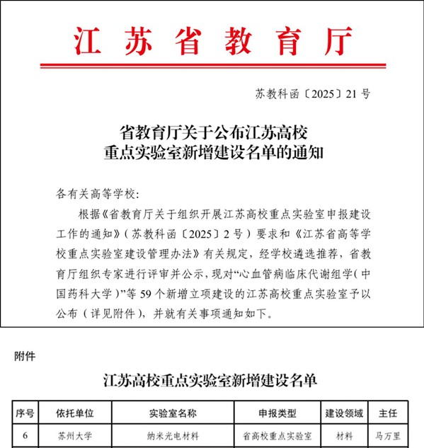 近日,江苏省教育厅发布《关于公布江苏高校重点实验室新增建设名单的通知》(苏教科函〔2025〕21号),我院“纳米光电材料省高校重点实验室”获批立项建设。
