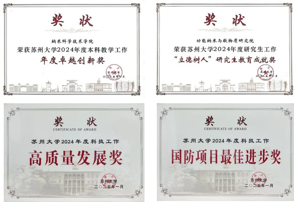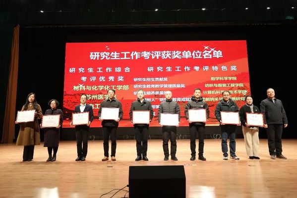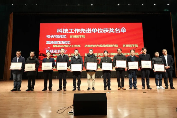 2025年1月11日下午,苏州大学2024年度教学与科研工作总结大会在天赐庄校区存菊堂隆重召开。校党委书记张晓宏等校领导,以及全校教学与科研相关工作代表出席会议。大会先后就2024年度本科教学和研究生工作、人文社科和自然科学等方面工作进行了总结,并对先进单位进行了表彰。我院荣获本科教学工作年度卓越创新奖、研究生工作“立德树人”研究生教育成就奖、科技工作高质量发展奖、科技工作国防项目最佳进步奖等四项奖励。