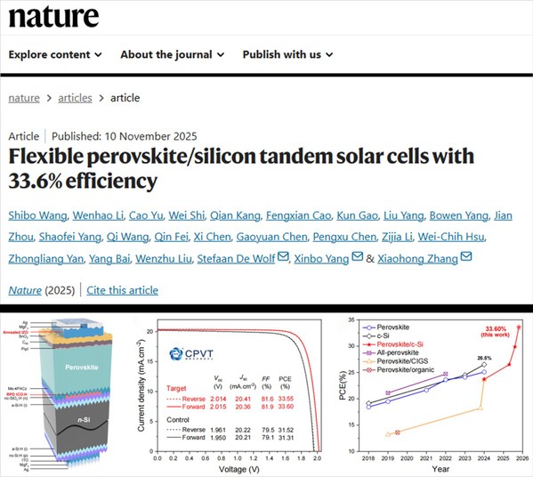 针对上述问题,苏州大学张晓宏教授、刘江教授、杨新波教授,联合沙特阿拉伯阿卜杜拉国王科技大学(KAUST) Stefaan De Wolf教授以及隆基绿能公司何博、曲铭浩、徐希翔、李振国等,通过采取两种不同的创新策略,分别围绕“稳定性”和“转换效率”取得了突破。两项研究成果于2025年11月10日在《Nature》期刊上在线发表,标志着柔性叠层光伏技术向实际应用迈出了重要一步。