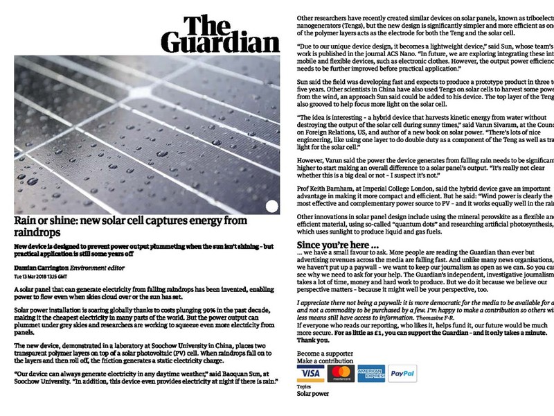 近日,我院孙宝全教授和孙旭辉教授课题组合作,在助理研究员文震博士(通讯作者)、博士生刘玉强(第一作者)和硕士生孙娜(共同一作)的共同努力下,成功研制了一种共享电极的太阳能电池和摩擦纳米发电机的集成器件,实现了晴天和雨天同时发电,相关成果发表在国际知名期刊《ACS Nano》上,题为“Integrating a Silicon Solar Cell with a Triboelectric Nanogenerator via a Mutual Electrode for Harvesting Energy from Sunlight and Raindrops”。该成果引起科学界和商业界关注,被《The Guardian》(又称卫报,英国三大报刊之一)、《新华社》、《American Chemical Society》、《Phys.Org》等数十家知名媒体报道,并被《Science Daily》、《网易》、《凤凰网》等近百家主流新闻杂志网站广泛转载刊登。