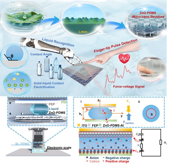 针对上述挑战,苏州大学功能纳米与软物质研究院文震教授、孙旭辉教授与西交利物浦大学刘伊娜副教授合作,发展了一种高精度液体识别新策略:融合水滴力学与固-液界面接触起电效应。通过利用液滴的非胡克力学特性,研究团队制备出一种受荷叶启发的氧化锌-聚二甲基硅氧烷(ZnO-PDMS)超疏水固-液传感器。基于其特殊的力-电学耦合界面,该传感器在多个性能指标上表现出卓越的性能:在5000次压缩循环和10天时间内保持稳定的输出,并在一定范围的温度和相对湿度水平下可靠运行,并实现高达281 mV/Pa的液滴压力灵敏度。该传感器在检测多种溶液成分方面取得重要突破,对金属离子的检测分辨率达到5 nM,对酒精浓度的分辨率达到0.1%。通过设计双层堆叠器件结构,摩擦电信号可被解耦为机械与接触起电双模式信号,结合门控循环单元(GRU)模型,实现了对10种液体的智能识别达到了99%的超高准确率,创建了一个可靠的"液滴指纹库",为便携式液体监测开辟了新路径。