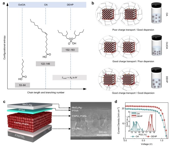 针对这一挑战,苏州大学功能纳米与软物质研究院袁建宇教授课题组引入了一种具有支链结构的熵型配体—双(2-乙基己基)磷酸酯(DEHP),在量子点合成过程中实现原位调控。研究发现,相较于传统线性配体,该熵配体可显著提升量子点在溶液中的胶体稳定性,同时通过更强的表面锚定与钝化作用,有效抑制表面缺陷并改善电荷传输性能,从而实现了“高分散性”与“高电学性能”的协同优化。基于该策略制备的甲脒铅碘(FAPbI3)量子点太阳能电池,其器件光电转换效率达到18.68%,并经认证效率为18.23%。同时,该器件在光照及环境条件下表现出优异的稳定性,刷新了该体系量子点太阳能电池的性能纪录。相关研究成果在线发表于Nature Communications(DOI: 10.1038/s41467-025-67340-0),论文第一作者为我院2025届博士毕业生黄贺贺,目前黄博士正在研究院开展博士后研究工作。