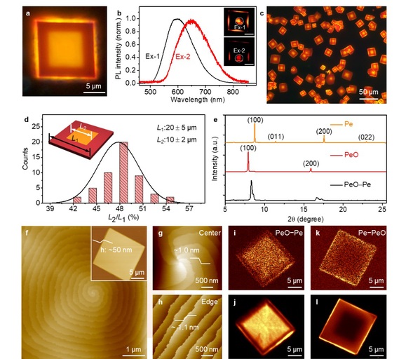针对上述挑战,近日,苏州大学功能纳米与软物质研究院(FUNSOM)的廖良生教授、王雪东教授团队联合苏州大学纺织与服装工程学院郑敏教授提出了一种将溶液相生长方法与物理气相沉积生长方法相结合的两步策略,设计并合成了一种2D有机横向异质结构。通过上述设计策略,一方面,苝(Pe)晶体和苝甲醛(PeO)晶体在二元溶剂协同作用下可以顺序成核并外延生长,因此形成Pe–PeO横向异质结构;另一方面,由于Pe–PeO异质结构在极小的区域内具有良好的化学组分分布,作为气相法的前体,有效避免了无序的物理气相沉积,进一步形成PeO–Pe横向异质结构。该策略不仅结合了两种方法的优势,即溶液法低成本处理工艺和气相法高质量单晶制备,并基于两种方法的各自特点,实现了二维异质结构的结构反转,为2D有机异质结构的制备展示了方法的交叉性和组合的多样性。此外,生长机理研究表明,二维异质结构晶体遵循螺旋位错生长行为,这有效避免了有机横向异质结构的体积膨胀和收缩,从而最大限度地减少异质界面处的连接缺陷。作为概念性应用展示,有机横向异质结构显示出良好的光传输能力和可调谐的空间激子转换,表明其在纳米光子学领域中的应用潜力。基于多环芳烃分子,利用溶液相生长方法实现数种2D有机横向异质结构的成功制备也进一步验证了上述合成策略的通用性。以上结果表明,该策略为合成2D有机横向异质结构提供了一种可行的思路,也为创建下一代光电器件提供了重要的材料基础和方法借鉴。相关成果已在期刊Nature Chemistry上发表(DOI: 10.1038/s41557-023-01364-1)。