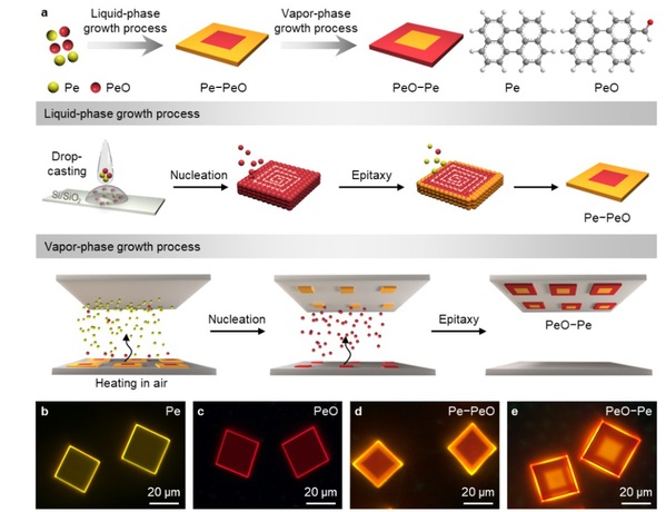 图1. 二维有机横向异质结构的策略示意图和荧光显微图像