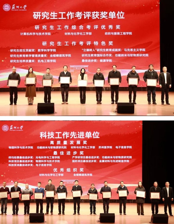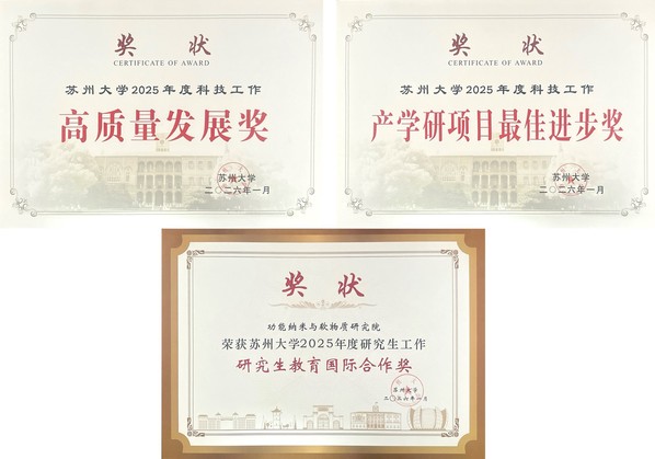 2026年1月11日,苏州大学召开2025年度教学与科研工作总结大会,全面回顾了学校在人才培养、科学研究、国际合作等方面取得的进展,并对年度表现突出的集体与个人进行表彰。我院荣获“苏州大学2025年度科技工作高质量发展奖”、“苏州大学2025年度科技工作产学研项目最佳进步奖”和“苏州大学2025年度研究生教育国际合作奖”三项荣誉。