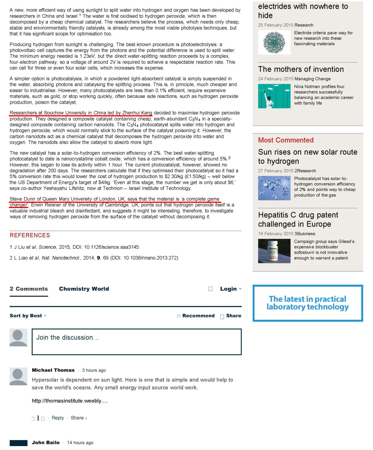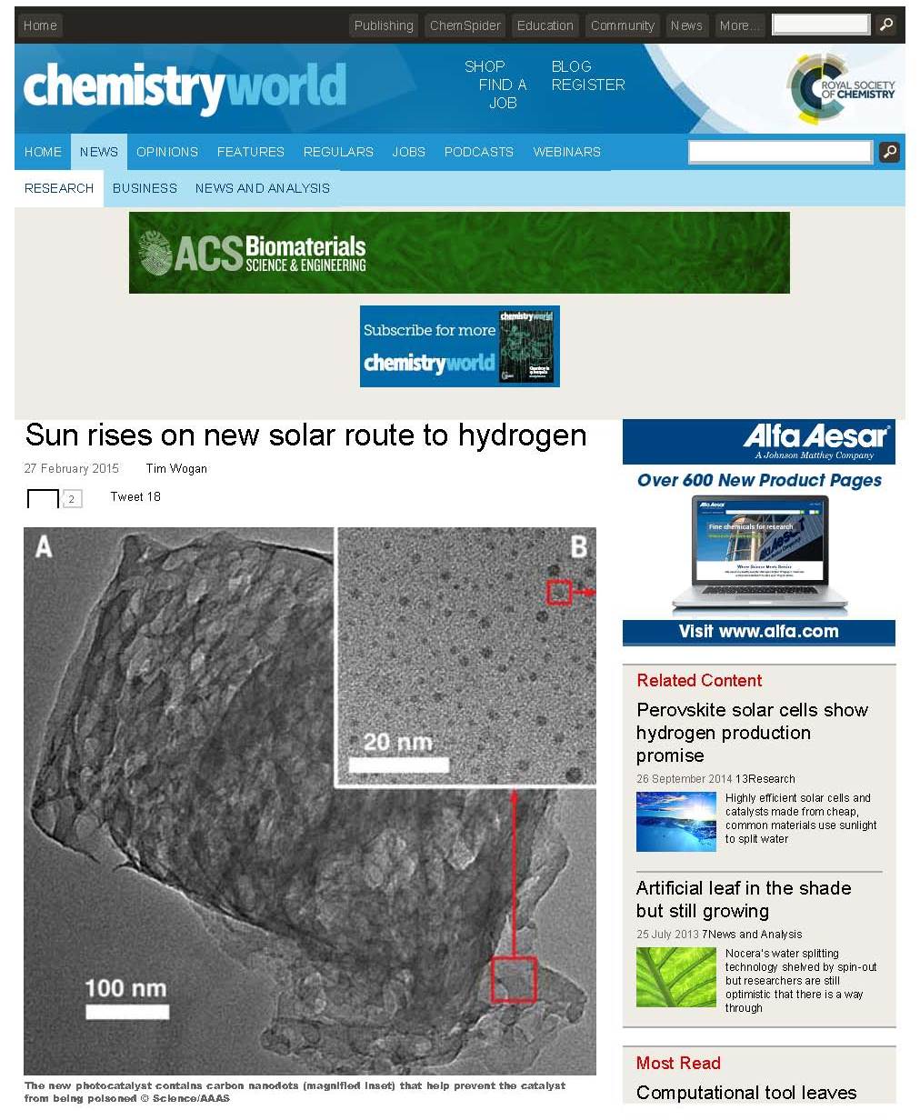 康振辉教授课题组发表于《Science》杂志的关于高效光催化电解水的研究工作(Science, 2015, 347, 970-974)被英国Chemistry World做专题介绍。该报道以“太阳能制氢的新曙光”为题形象而生动地介绍了该工作。英国伦敦大学玛丽女王学院Steve Dunn教授同时指出:“这是该领域的彻底变革”。