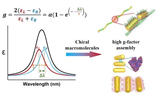 Figure 1 Chiral assembly of nanoparticles. The derived formula of g-factor guides the long-range ordered chiral assembly of gold nanorods induced by bio-macromolecules for plasmonic chiroptical properties with high g-factors.