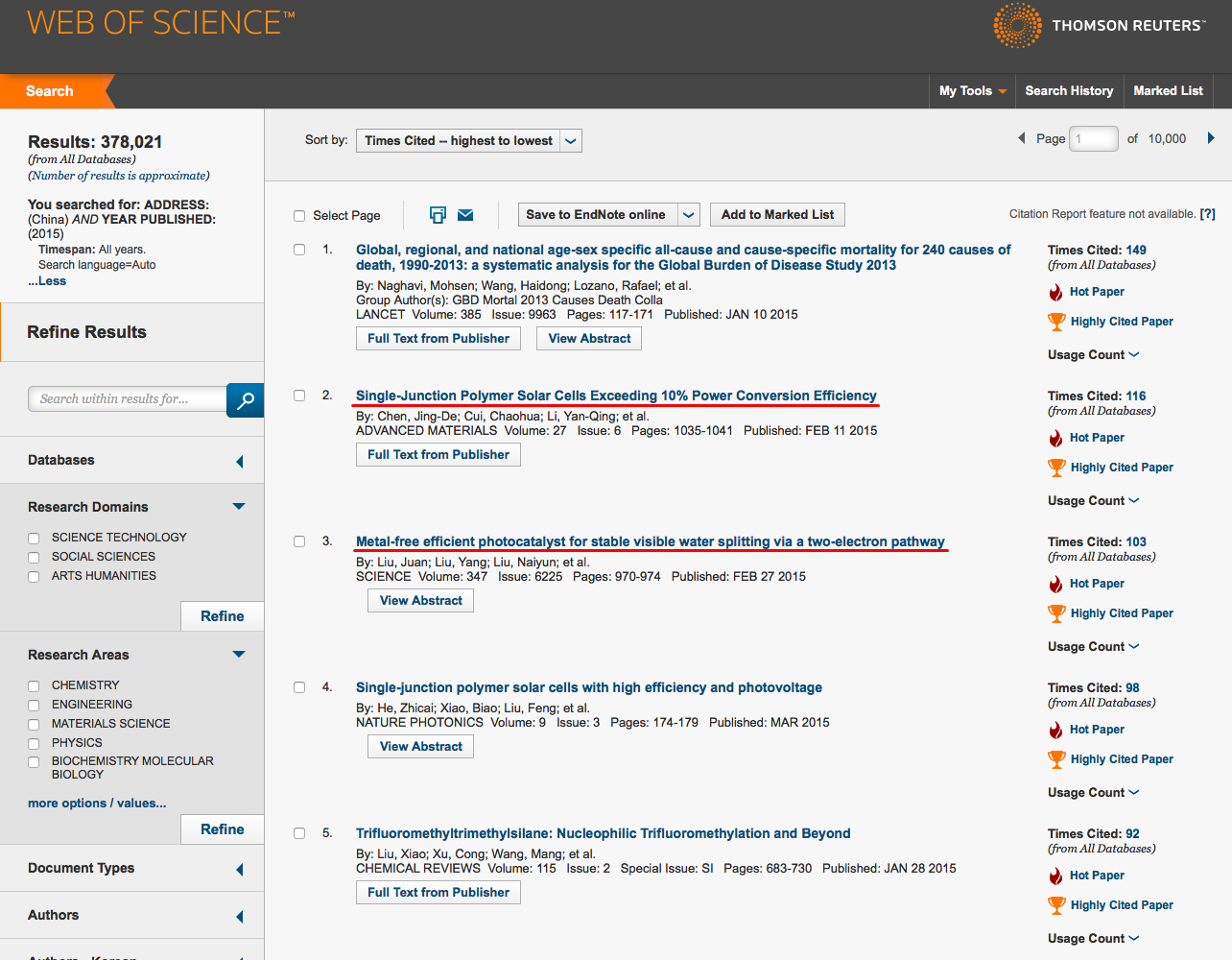 在辞旧迎新之际,Web of Science数据库显示,2015年度我院唐建新教授课题组在《Advanced Materials》期刊上发表的论文“Single-Junction Polymer Solar Cells Exceeding 10% Power Conversion Efficiency”(文章一)以及康振辉教授课题组在《Science》期刊上发表的论文“Metal-Free Efficient Photocatalyst for Stable Visible Water Splitting via a Two-Electron Pathway”(文章二)分别被引用116次与103次,这是2015年中国科研人员以中国为第一单位发表的SCI论文中,目前已被引频次最高的前两篇文章。