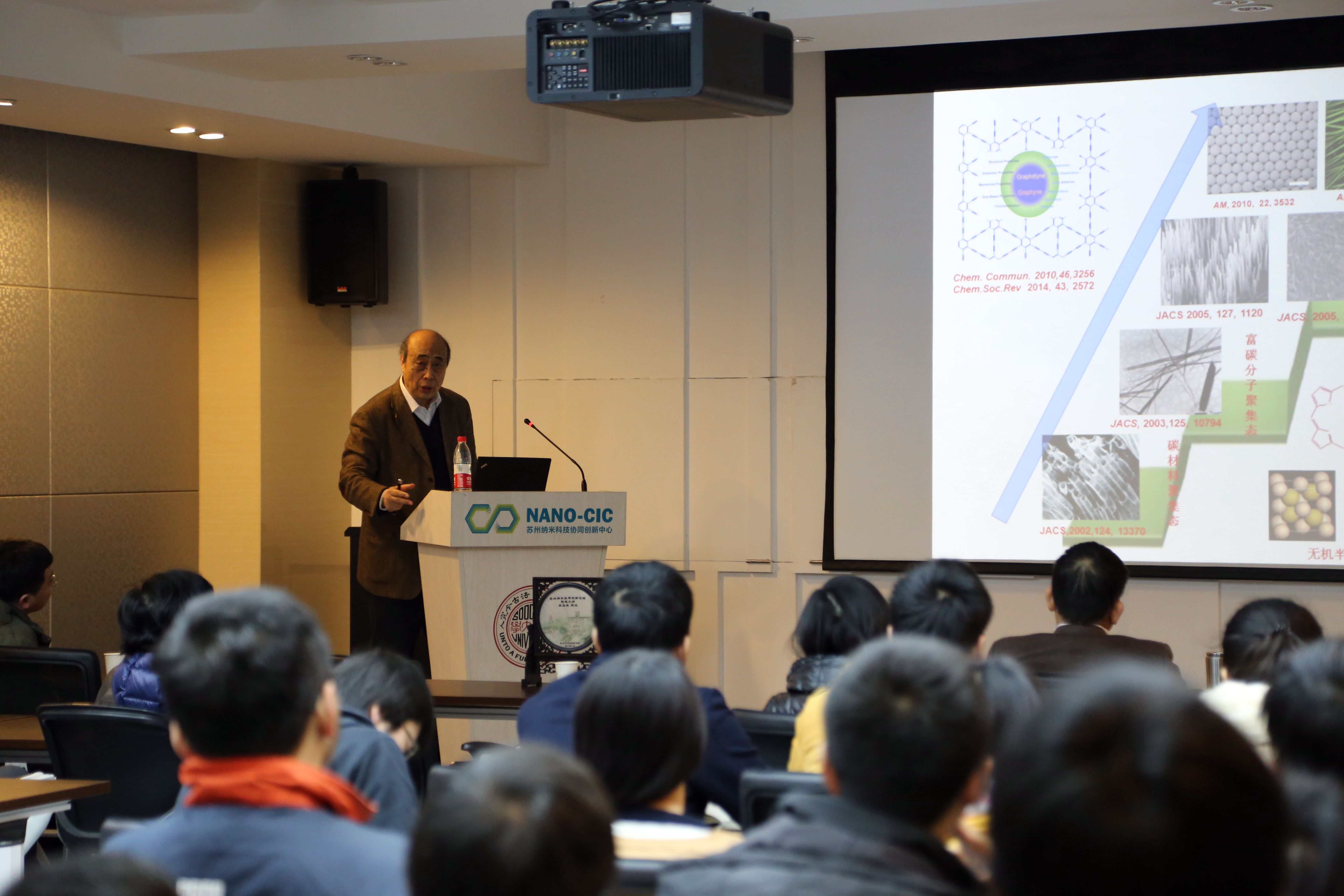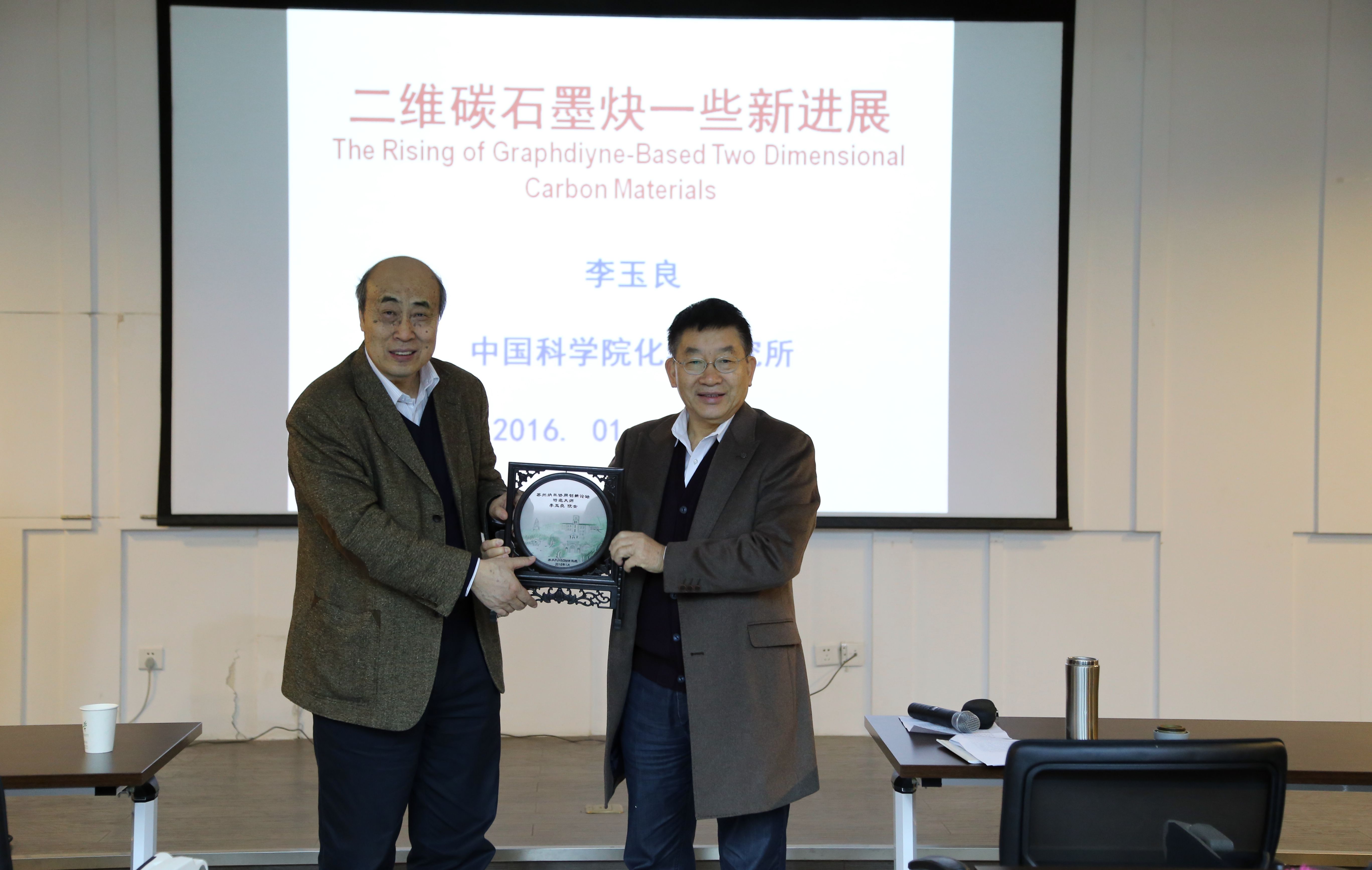 在909楼B厅,李述汤教授主持了李院士的学术报告会,热情洋溢地介绍了李院士的个人经历和研究特色。随后李院士以“The Rising of Graphdiyne-Based Two Dimensional Carbon Materials”为主题,为百余位师生细致地介绍了在石墨炔材料机理、制备和应用上独创性的工作。精彩报告获得了师生的广泛赞誉,大家对石墨炔这类新型的材料展开了热烈的讨论。
