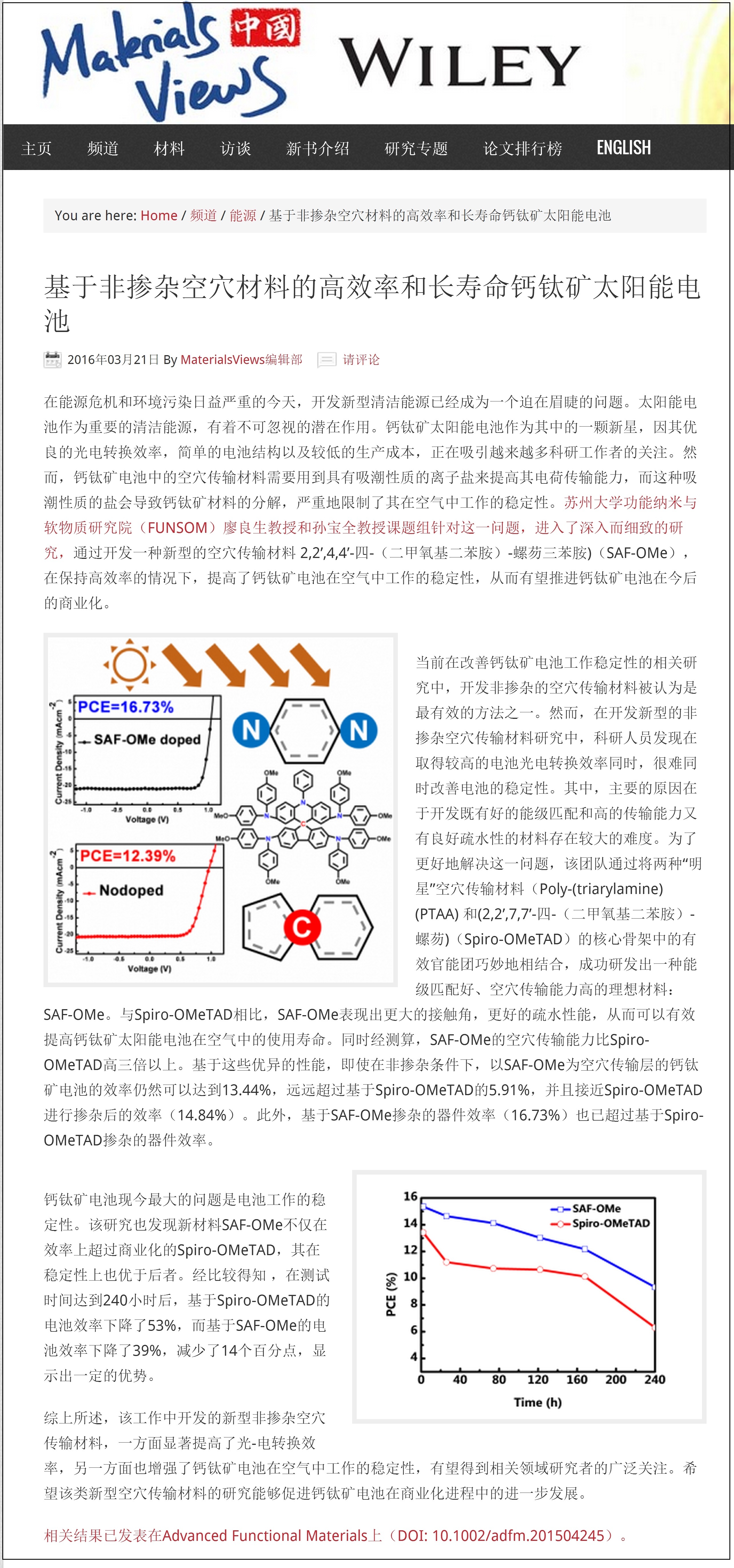 近日,我院廖良生教授课题组与孙宝全教授课题组合作在《Advanced Functional Materials》上发表的研究成果“Dopant-Free Spiro-Triphenylamine/Fluorene as Hole-Transporting Material for Perovskite Solar Cells with Enhanced Efficiency and Stability”被Materials Views China报道。