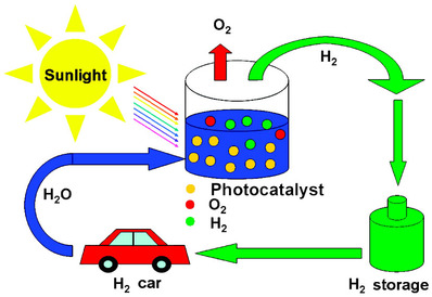 该论文主要介绍了课题组在高效光催化分解水研究中取得的成果。利用太阳能完全分解水同时制氢气和氧气是发展清洁、绿色能源的关键技术之一。在过去的四十年里,研究人员开发了一系列光分解水的光催化剂。然而这些光催化剂的太阳能到氢能的转化效率较低、稳定性也较差,阻碍了光分解水制氢的实际应用进程。康振辉课题组此次发表的论文(与李述汤教授、以色列理工学院的Yeshayahu Lifshitz教授合作)报道了一种新型光催化剂:碳纳米点-氮化碳纳米复合物。该催化剂由碳和氮两种元素组成,具有价廉、资源丰富、无污染的优点,并且稳定性较高,催化活性200天保持不变。它可以利用太阳能实现高效的完全分解水,与以往的光催化剂不同,整个光解水过程分为两个阶段(如图1所示):(1)氮化碳分解水生成过氧化氢和氢气;(2)碳纳米点将过氧化氢分解成水和氧气。此外,该光催化剂的太阳能到氢气的能量转换效率是2%,是目前同类催化剂的最高效率。按照美国能源署(DOE)的技术经济分析,太阳能到氢气的能量转换效率2%的催化剂,制氢成本约为6美元/公斤,这与DOE的目标成本(4美元/公斤)比较接近。该催化剂的进一步优化和开发对于推动太阳能制氢的清洁能源策略(例如图2)具有重要的实践意义。