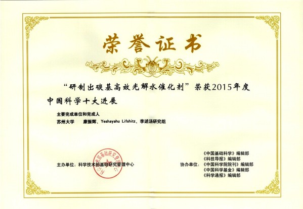 康振辉教授课题组题为“Metal-Free Efficient Photocatalyst for Stable Visible Water Splitting viaa Two-Electron Pathway”的论文,在2015年2月27日出版的国际顶级学术期刊《Science》杂志发表,这是我院成立六年多来首次在该杂志发表论文(第一单位,第一作者),也是我校科研人员在该期刊上发表的首篇自然科学类学术论文,该成果入选“2015年度中国科学十大进展”。