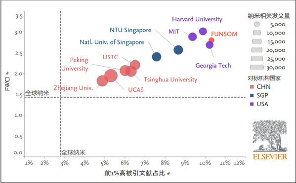 *一流机构是指全球在纳米领域2008-2022年间发表前1%高被引文献数量最多的10所机构,对于CAS, CNRS仅包括其二级研究所。本图中,FUNSOM的全部文献纳入分析,对标机构在纳米领域的文献纳入分析。