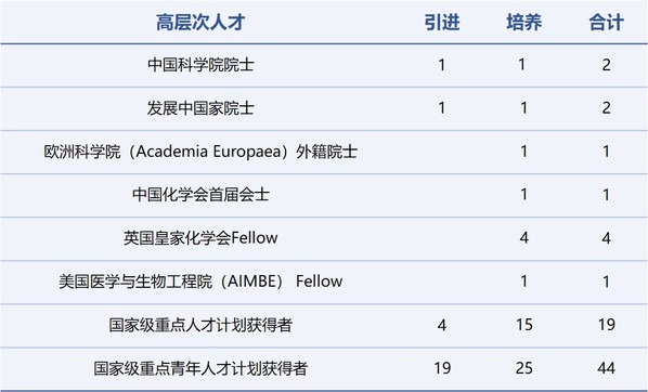 自主培养中国科学院院士1人次(2021年)、欧洲人文和自然科学院(Academia Europaea)外籍院士1人次(2021年)、发展中国家科学院院士1人次(2023年)。