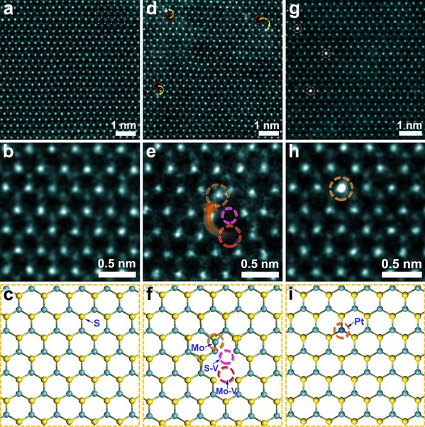 近日,我院李彦光教授联合天津理工大学罗俊教授、湖南大学刘松教授和华东理工大学戴升教授首次在单层MoS2基面上制备出一种新型弗伦克尔原子缺陷结构(Frenkel-defected),通过研究表明该缺陷结构在电催化析氢反应中具有优异的催化活性。该工作通过球差矫正电镜,首次将教科书中的经典“弗伦克尔缺陷”真实的原子结构呈现出来。结合微纳电化学测试装置,含有弗伦克尔缺陷的MoS2在10mA cm-2电流下对应过电位仅为164 mV。该性能明显优于完美单层MoS2(10mA cm-2, 358 mV)和Pt单原子掺杂的单层MoS2(10mA cm-2, 211 mV)。理论计算表明,弗伦克尔缺陷的引入在MoS2基面上形成独特的电荷分布,进而更加容易吸附活性氢原子。本文为研究二维过渡金属硫化物基面上不同原子缺陷结构和其催化活性之间的构效关系提供了新的思路。我院许杰博士为本文共同第一作者(排序第一)。