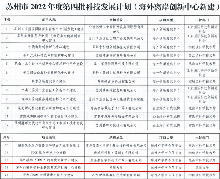 近日,苏州市2022年海外离岸创新中心新建项目立项名单发布,评选出五个海外产学研合作平台,我院“苏州材料科学和生物医药离岸创新中心建设”项目入选,也是我校首个入选项目,标志着我院科技创新工作实现了“国内创新”和“离岸创新”双轮驱动。