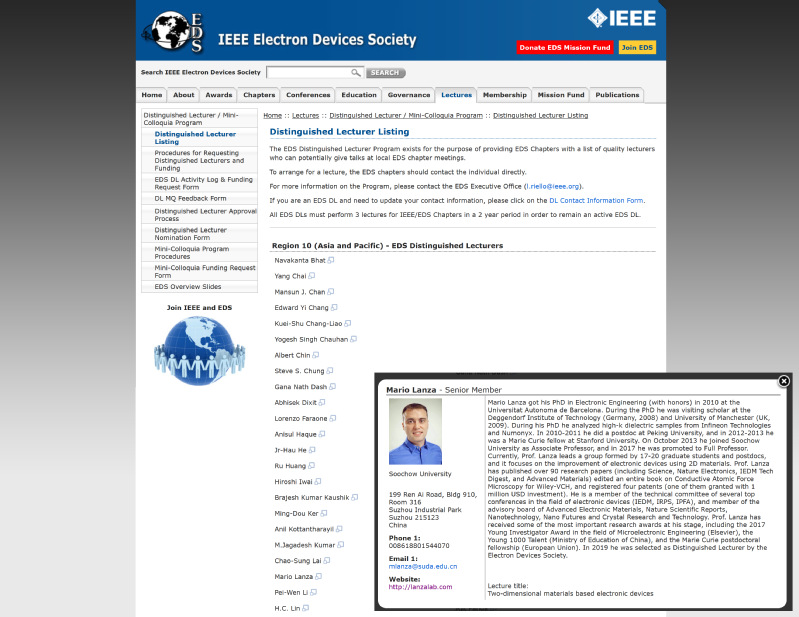 近日,我院Mario Lanza教授当选美国电气与电子工程师协会(IEEE)电子器件学会Distinguished Lecturer(EDS Distinguished Lecturer)。Lanza教授主要是基于他在二维材料电子器件领域所作出的杰出贡献获得此项殊荣。据悉,包括Lanza教授,目前中国大陆仅4位科学家获得此项荣誉,其他3位分别是:黄如教授(北京大学,院士)、刘明教授(中国科学院,院士)、任天令教授(清华大学,长江学者特聘教授)。在此谨向Lanza教授表示热烈祝贺!