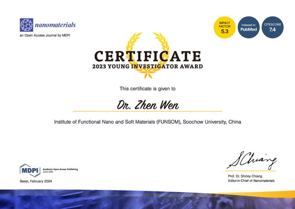 Nanomaterials 期刊是由多学科数字出版机构MDPI (Multidisciplinary Digital Publishing Institute) 出版的国际同行评议的开放获取 (OA) 期刊。为奖励在纳米科学和技术领域取得卓越成就的年轻研究人员,该期刊于2018年开始设立Young Investigator Award (青年学者奖) 。本年度获得该奖项的共有三位学者,另外两位获奖者是英国牛津大学Robert Hoye博士和美国麻省理工学院Deblina Sarkar博士。