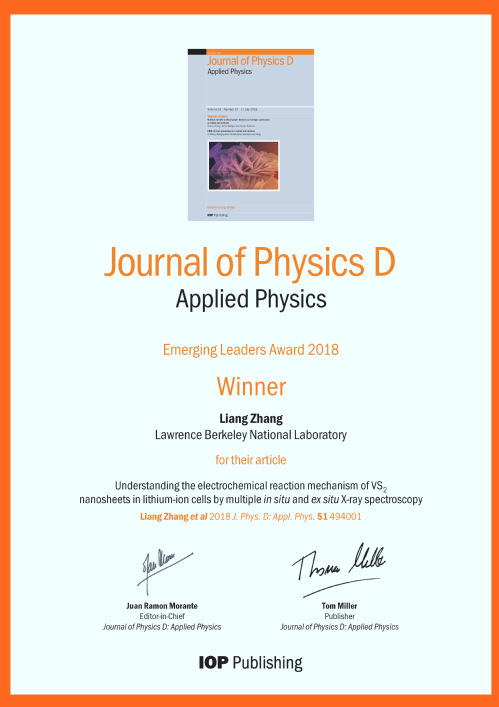 近日,我院张亮教授荣获英国物理学会Journal of Physics D杂志JPhyD Emerging Leaders Award奖励,以表彰其在原位同步辐射X射线谱学装置的研制及其在新能源材料的应用研究领域所作出的杰出贡献。在此谨向张亮教授表示热烈祝贺!