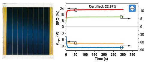 近日,苏州大学功能纳米与软物质研究院张晓宏教授、彭军教授与洛桑联邦理工学院Mohammad Khaja Nazeeruddin教授、Paul J. Dyson教授、Zhaofu Fei教授,以及华北电力大学丁勇教授等多个课题组团队合作,通过采用氯化甲铵(MACl)作为掺杂剂、1,3-双(氰甲基)咪唑氯化物([Bcmim]Cl)作为Lewis碱性离子液体添加剂的策略,显著抑制了钙钛矿前驱体溶液的降解,减少了MACl聚集,从而制备出了取向生长、结晶优良的高质量钙钛矿薄膜。在孔径面积约为27.22cm2的钙钛矿电池组件上实现了22.97%的稳态效率,成功刷新了钙钛矿组件稳态效率的世界纪录(国家光伏产业计量测试中心,NPVM认证)。此外,在65摄氏度的工作条件下,经过连续1000小时光照老化后,测试获得的钙钛矿电池组件效率仍保持初始值的87.19%,这充分证明了其出色的光热稳定性。