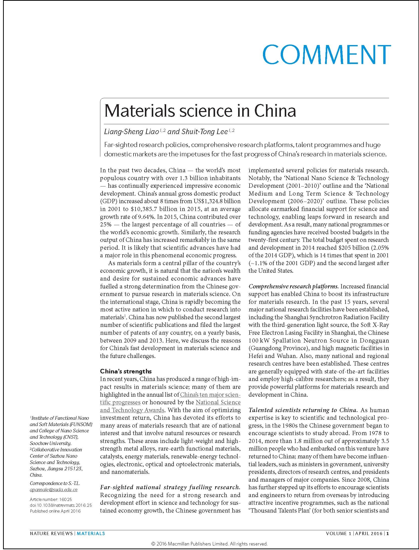 近日,李述汤院士、廖良生教授应邀为《Nature Reviews Materials》撰写的评论文章“Materials science in China”(Nat. Rev. Mater., 2016, 1, 16025.)正式在线发表。这是我院也是苏州大学的科研人员首次在“Nature Reviews”系列期刊上发表评论文章(第一单位,第一作者)。
