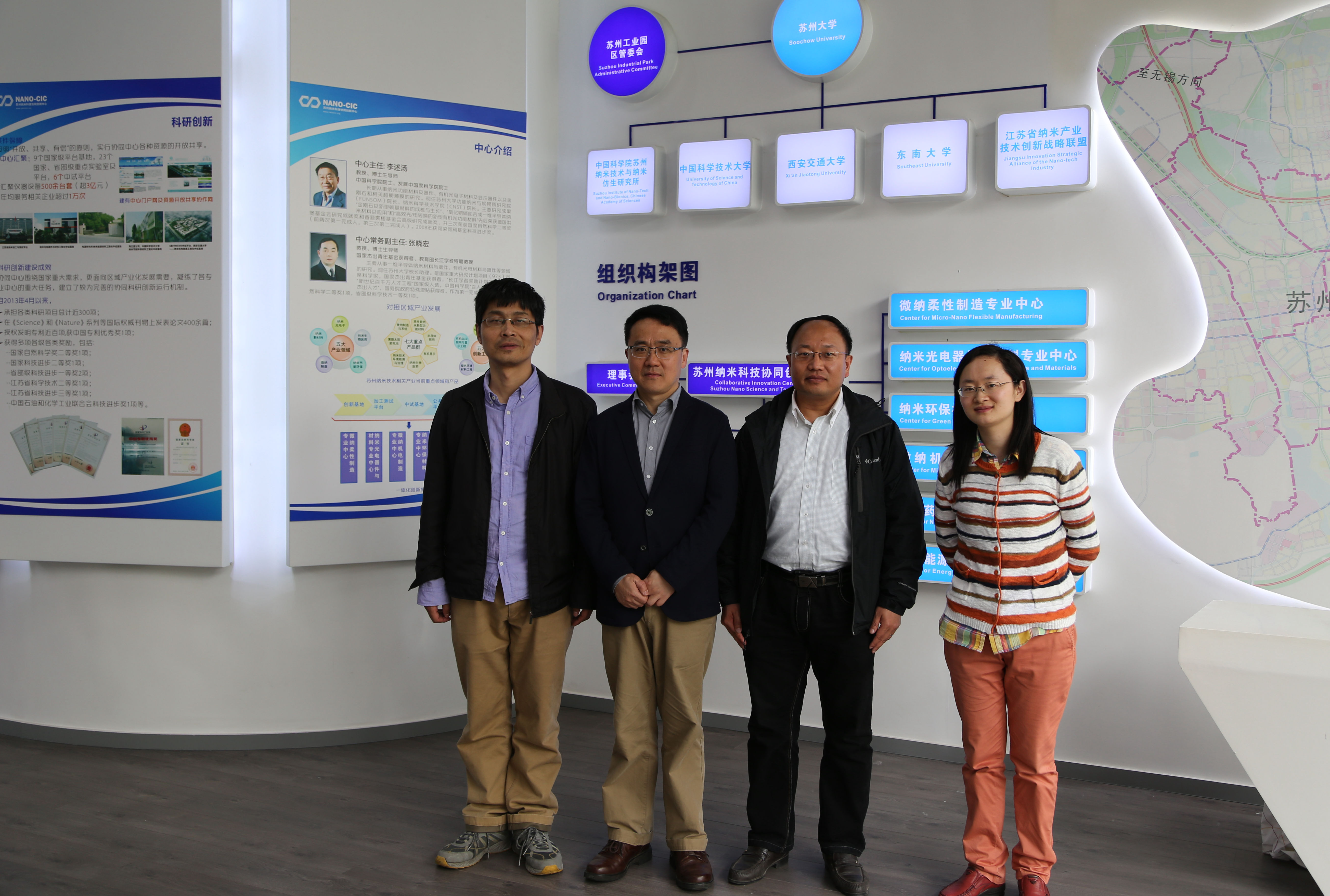 报告会后徐昕教授、刘轶教授在我院李有勇、徐来等教师陪同下参观了我院。李有勇教授详细介绍了功能纳米与软物质研究院、纳米科学技术学院和苏州纳米科技协同创新中心的发展与成果。双方进行了深入的学术交流,徐教授听取了我院在功能纳米材料、光电能源材料、纳米生物方向的模拟与设计工作,也对我院的计算材料研究提出了宝贵的意见和建议。