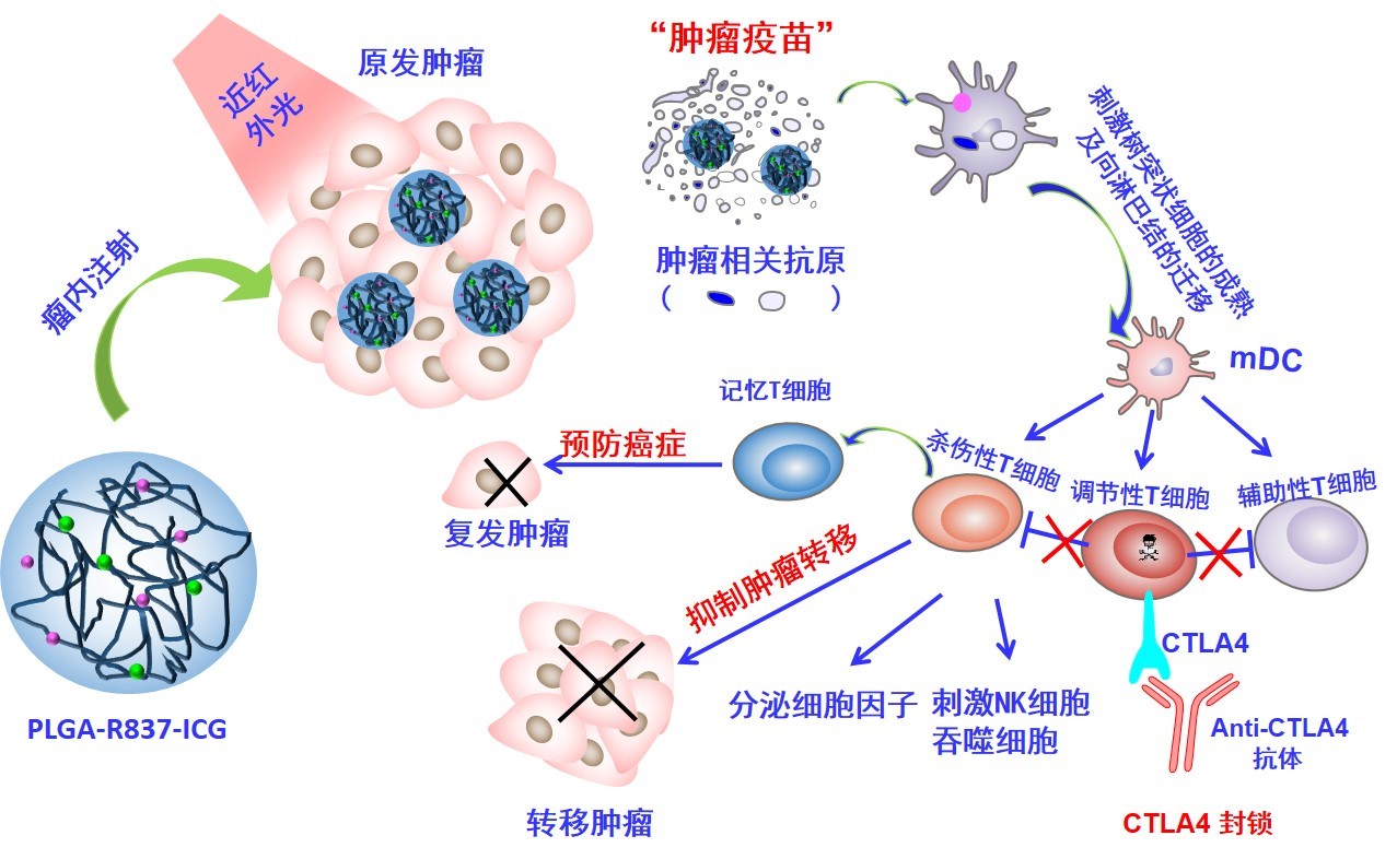 在癌症治疗的过程中,开发新型的肿瘤治疗策略实现不仅可以消除原发肿瘤,还能抑制癌细胞转移并且防止肿瘤复发,是科研工作者一直以来的梦想。在此,刘庄教授与彭睿教授课题组合作,首次提出了一种癌症免疫疗法的新概念,即利用纳米粒子的光热效应消除原位肿瘤并生成“肿瘤疫苗”。具体来说,他们首先利用三种FDA批准的分子:吲哚花青绿(ICG,光热剂),咪喹莫特(R837,Toll样受体7刺激剂),和聚(乳酸-乙醇酸)(PLGA)合成了PLGA-ICG-R837的纳米颗粒。这种PLGA-ICG-R837颗粒注射到肿瘤部位,在近红外光的照射下不仅能有效地消除原发性肿瘤,同时释放出的多种肿瘤相关抗原并与R837一起发挥类癌症相关“疫苗”的作用。再加以免疫检验点抑制剂CLTA4抗体(以阻断免疫抑制性Treg细胞的作用),该“疫苗”的抗肿瘤效果则会被进一步增强。在与免疫检验点抑制剂anti-CTLA4的联合使用下,这种在体产生的癌症相关“疫苗”诱导的免疫应答能够有效地抑制肿瘤细胞的转移,并在多种肿瘤模型上取得了很好的治疗效果。更令人兴奋的是,在实验中,利用PLGA-ICG-R837光热效应消除第一个肿瘤40天后接种第二个肿瘤,同时给小鼠静脉注射抗anti-CTLA4抗体。我们发现,利用PLGA-ICG-R837光热效应消除第一个肿瘤和anti-CTLA4的联合使用,小鼠的第二个肿瘤有明显的抑制。因此利用光热效应消除原发肿瘤产生癌症“疫苗”在小鼠上能产生强烈免疫记忆效应。光热消除原发性肿瘤产生的癌细胞相关抗原和R837的纳米可以作为癌症相关“疫苗”,在与anti-CTLA4的联合使用下很有可能可以有效地消融多种原发性肿瘤,抑制肿瘤转移,并触发强免疫记忆效应,防止肿瘤的复发。