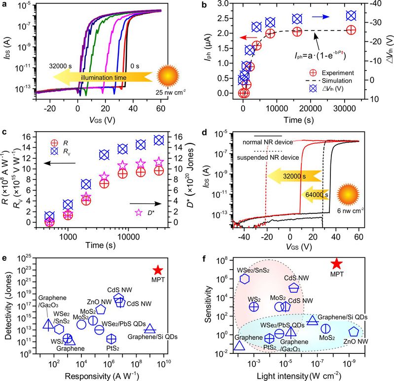 弱光探测在夜视、遥感、天文观测和量子通讯等领域有着重要的应用。目前商用的弱光探测器主要包括光电倍增管和雪崩光电二极管等,它们通过倍增光生电流实现输出电信号的放大。然而,这些器件通常尺寸较大,或需要高工作电压(100-1000 V),使其与数字成像系统中的微电子电路难以兼容。近年来,基于低维半导体纳米结构的光电探测器由于其高灵敏度、高集成度而引起了极大的关注。在光电探测器的主要参数中,探测度是评估其对弱光探测能力的关键参数之一。目前研究者们主要通过提高光电探测器的光电转换效率,或者降低光电探测器的暗电流来实现器件高的探测度。但是,由于单个入射光子通常只能在半导体中激发一对电子和空穴,因此产生的光电流Iph取决于入射光强度P,并遵循光电转换幂定律Iph~Pα。随着P增加,Iph呈现亚线性或线性增加。在实际器件中,由于材料中存在的缺陷会导致光生电荷发生复合,使得器件的光电转换效率降低,因此α值通常小于1。即使对于理想的光电探测器(α=1),其光电转换效率仍然受到光电转换幂律的限制,在弱光照射下表现出较低的灵敏度。众所周知的是,在传统的胶片摄影中,通过对底片进行长时间的曝光,可以实现在弱光或者夜景下进行拍摄。因此,如果可以在光电探测器上集成电荷存储功能,通过光电信号的长时间累积,有望大幅度提高器件对弱光的探测能力。