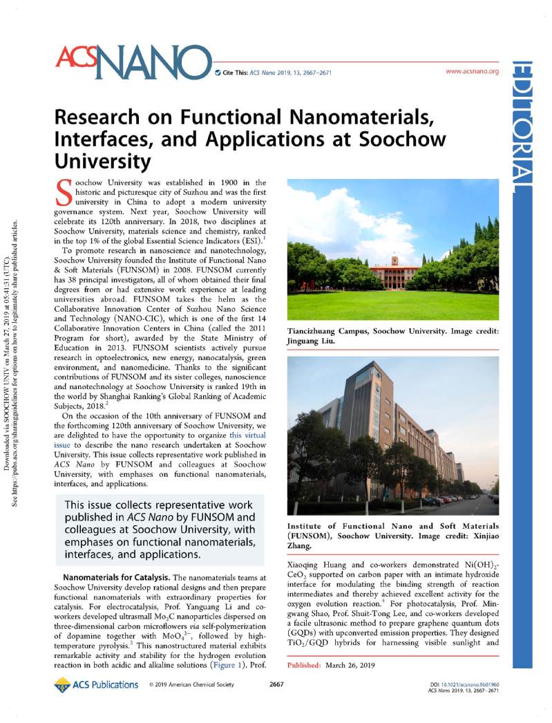 2019年3月26日,纳米科技领域国际顶级期刊《ACS Nano》以专刊形式报道了苏州大学近年来在功能纳米材料、表界面及相关应用中取得的研究成果,引起了国内外同行的广泛关注。