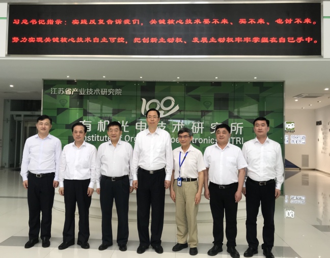 6月5日上午,江苏省委常委、苏州市委书记蓝绍敏在苏州市委常委、秘书长俞杏楠 、吴江区委书记王庆华、吴江区委副书记、区长李铭、吴江区委常委、汾湖高新区党工委书记万利等领导的陪同下,莅临我院产业化基地——江苏省产业技术研究院有机光电技术研究所考察调研。研究所所长李述汤院士、执行所长廖良生、检测中心主任唐建新、执行所长助理祝晓钊等人陪同接待。