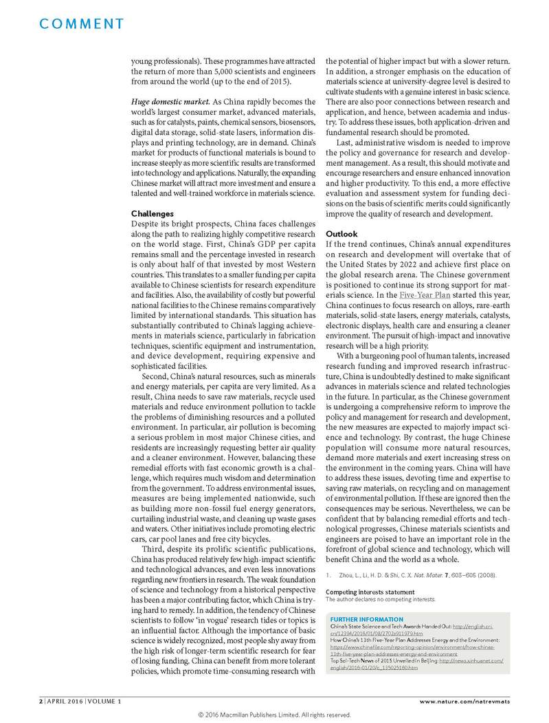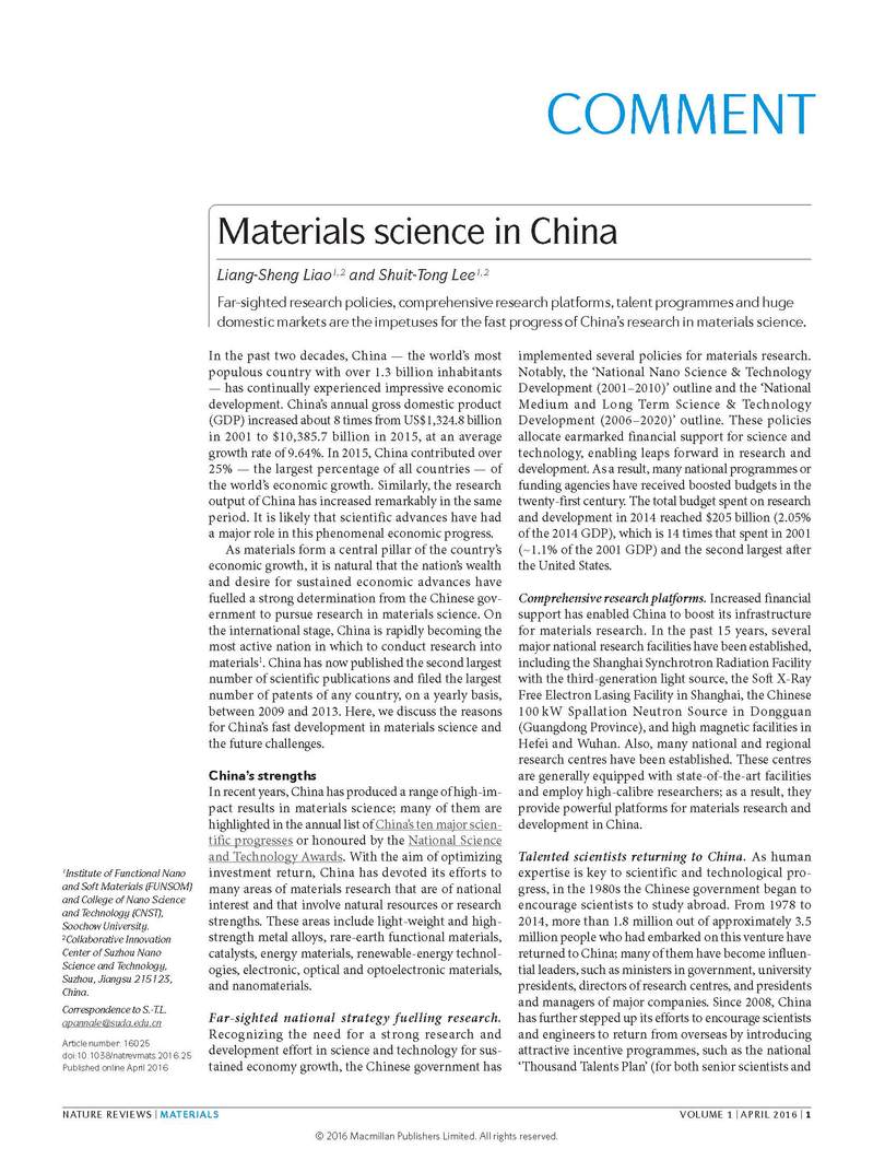 入本世纪以来,中国经济不断强大,使得世人对中国材料科学与技术的发展给予了越来越多的关注。此次李述汤院士和廖良生教授应邀针对我国材料科学15年来的发展状况,从优势、挑战和展望三方面进行了精辟论述,认为我国高瞻远瞩的科研政策、不断完善的研究平台、高层次的人才计划以及庞大的国内市场是中国材料科学与技术近年来飞速发展的推动力;并且相信我国材料科技人员终将站在世界科技前沿,为我国乃至世界的经济发展做出重要贡献。通过《Nature Reviews Materials》这一重要窗口在科学界向世人介绍中国材料科学与技术的发展,具有重要意义。