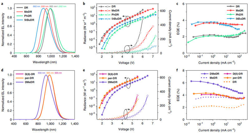近红外有机电致发光二极管(NIR OLED),尤其是发光波长达到或超过1000 nm(近红外二区,NIR (II))的器件,在光疗、生物成像和可穿戴医疗设备(例如,血氧仪和光疗贴片)等领域的应用发挥着重要作用。然而受能隙定律的约束,当发光波长移向深红色和近红外区域时,快速的非辐射失活过程会极大地降低发光强度,导致显著的发光猝灭,从而限制了NIR OLED的发展。