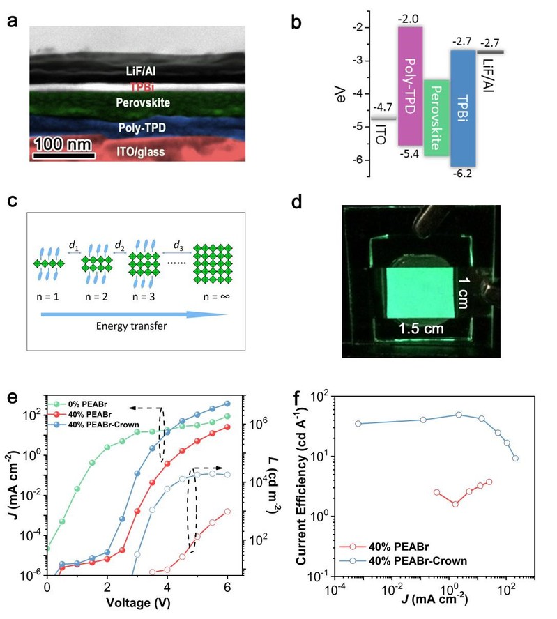 该研究解决了准二维钙钛矿薄膜中有机-无机相之间的分离问题,实现了钙钛矿激子能量在钙钛矿晶体中的有效传递,同时解释了准二维钙钛矿发光的光物理机理,对实现高效的钙钛矿发光二极管具有重要的科学意义。