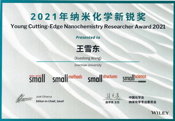 近日,在2021年中国化学会年会期间,举行了第四届“纳米化学新锐奖”颁奖仪式,我院王雪东副教授荣获“纳米化学新锐奖”。在此谨向王雪东副教授表示热烈的祝贺!
